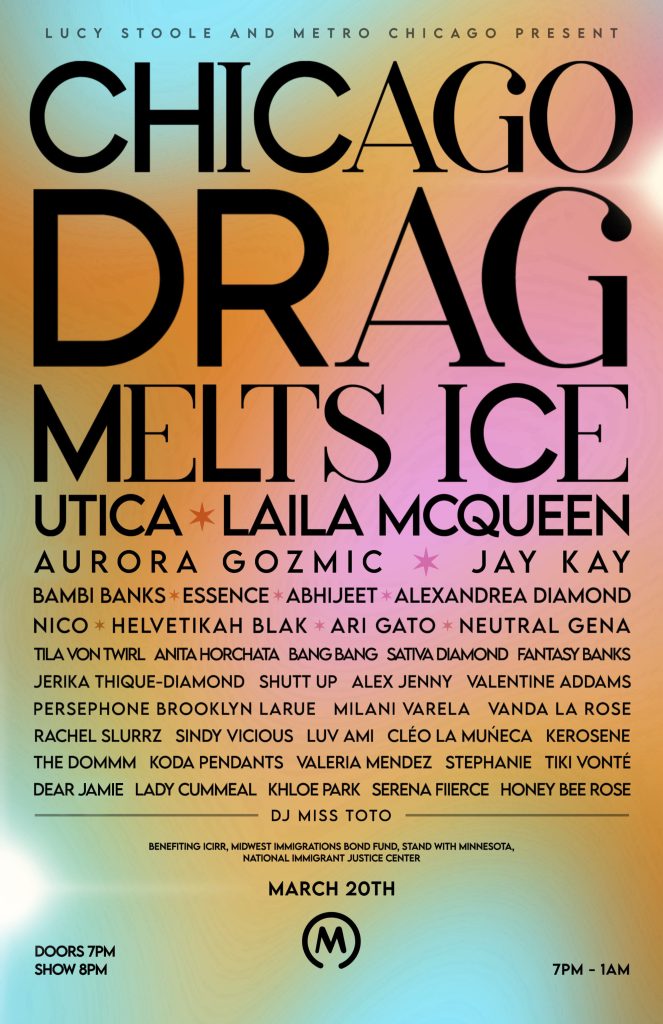 Chicago Drag Melts ICE will hit the stage Friday at the Metro, 3730 N. Clark St. The doors open at 7 p.m., and the show begins at 8 p.m. The event is 18-and-older, and tickets for $26.23 can be bought here.