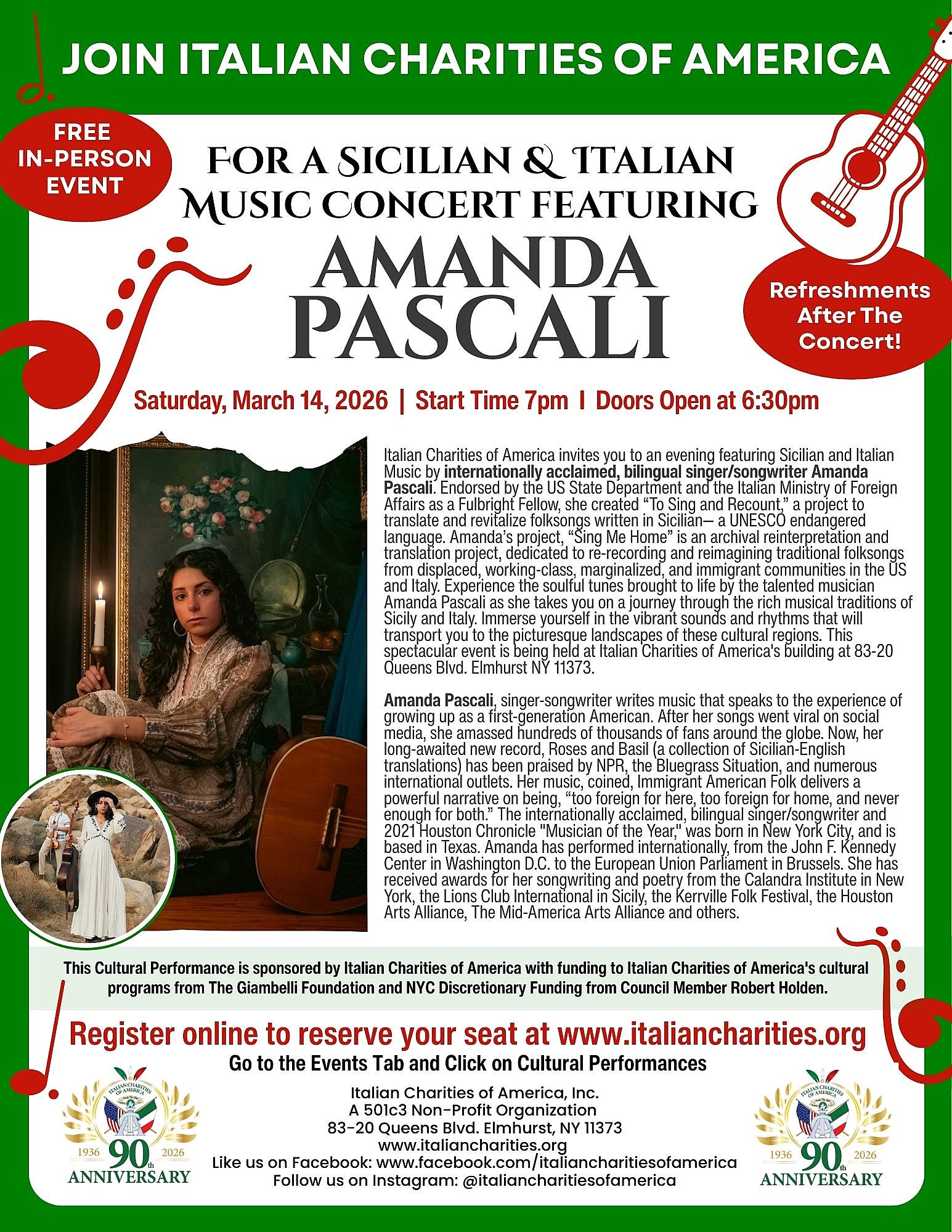 The flyer with Amanda Pascali’s bio which was distributed advertising the free concert.