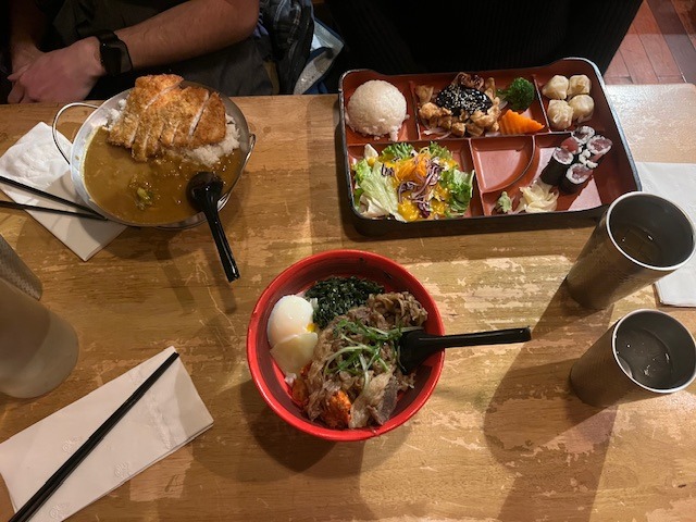When the food came, after a short wait, I was pleasantly surprised. I ordered a bulgogi donburi, which is a Japanese rice bowl, but with Korean marinated beef and kimchi. Gavin ordered chicken katsu with curry and Lovis ordered a bento box. They were all plated very neatly.