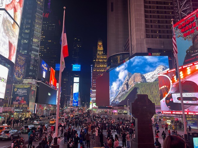 The hustle and bustle of Times Square, a glowing canyon of billboards and advertisements.
