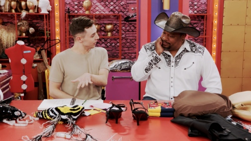 Really, the only pairing I’m worried about is the buggery Nini is inflicting on her partner. Out of all the queens, Nini seems very empathetic to Jason without the edit presenting a connection between their experiences. It’s also mystifying to watch Jason talk about never being allowed to explore his feminine side only for Nini to give him a felt cap with antennae on it. I remember similar side-eye being thrown Suzie’s way last year for wrapping her mom in monochrome and scotch tape, but that read as a diva constructing her drag family outfits on set, with Mama Toot giving very removed input. Jason tells Ru he’s enthusiastic to be the caterpillar to Nini’s butterfly in their one-on-one table talk, but it’s presented like he’s being slotted into a theme without the room to give much input.