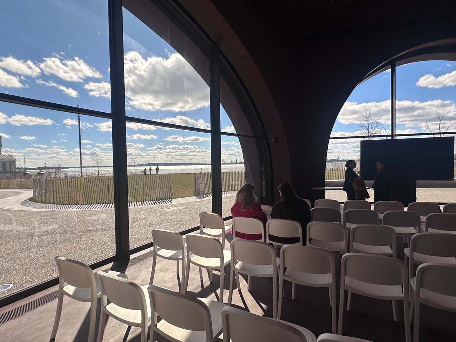 The new space features lofty arched ceilings and massive windows that frame views of the Hudson River, Statue of Liberty, and beautiful sunsets. The opening of the Classroom is part of a bigger project to complete the Wagner Park Pavilion.