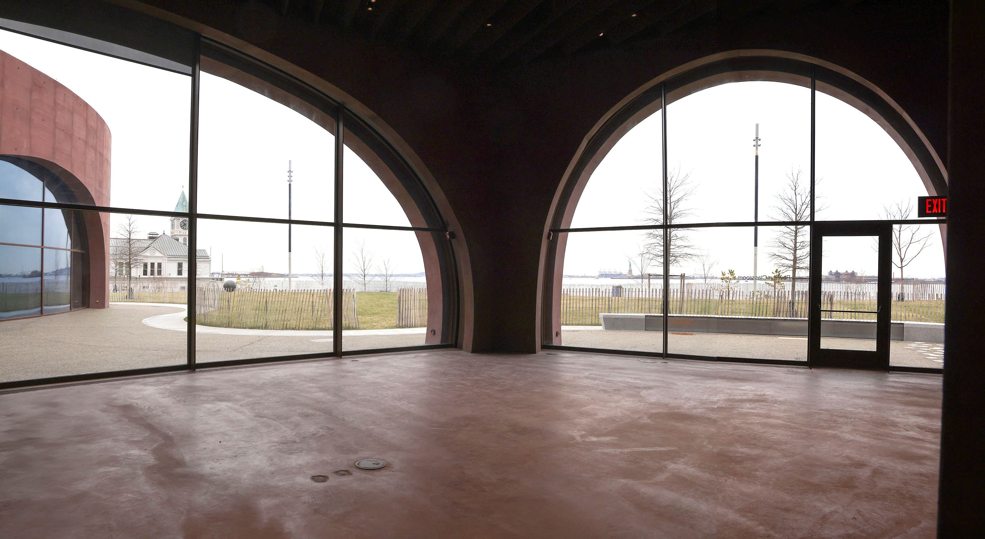 The new space features lofty arched ceilings and massive windows that frame views of the Hudson River, Statue of Liberty, and beautiful sunsets. The opening of the Classroom is part of a bigger project to complete the Wagner Park Pavilion.