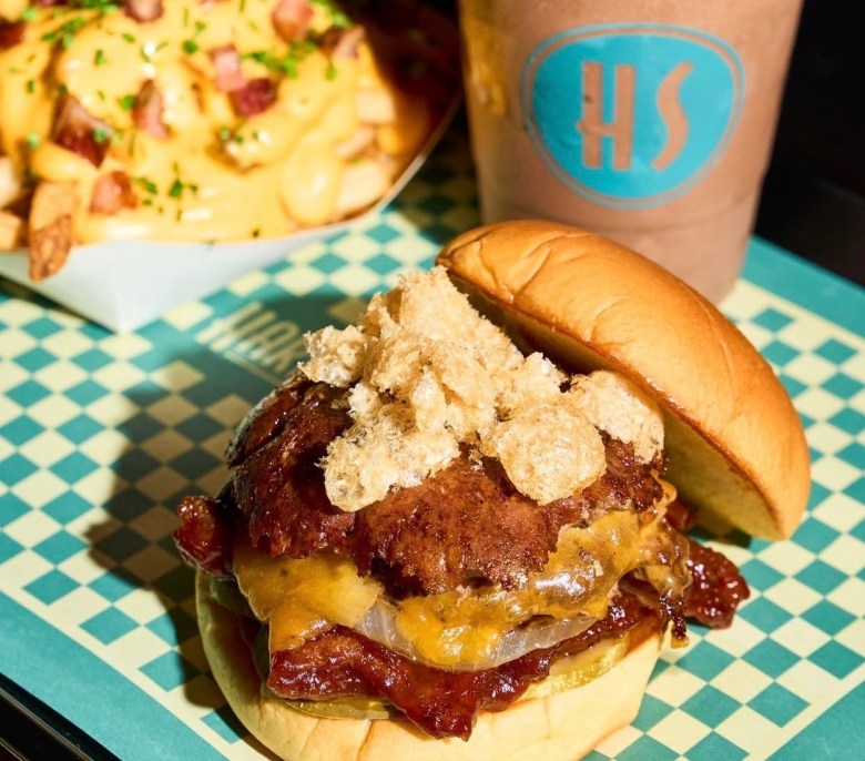 Harlem Shake’s menu kicks off with burgers made with custom blend Pat LaFrieda patties, Impossible meat patties, or veggie patties. There’s a classic version with American cheese, onions, pickles, and special sauce, a version with jerk fries and jerk mayo, and a version called the “hot mess” with pickled cherry peppers and bacon relish.
