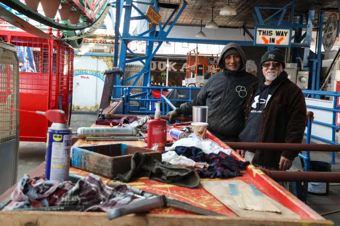 Exactly one week before the grand reopening of the People’s Playground, DJ assisted with operating the Wonder Wheel while Teddy handled the forklift used to lift and position its massive cars.