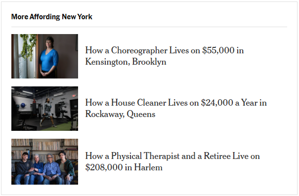However, The New York Times has been doing a series on what it’s like to live in New York City on various levels of income: