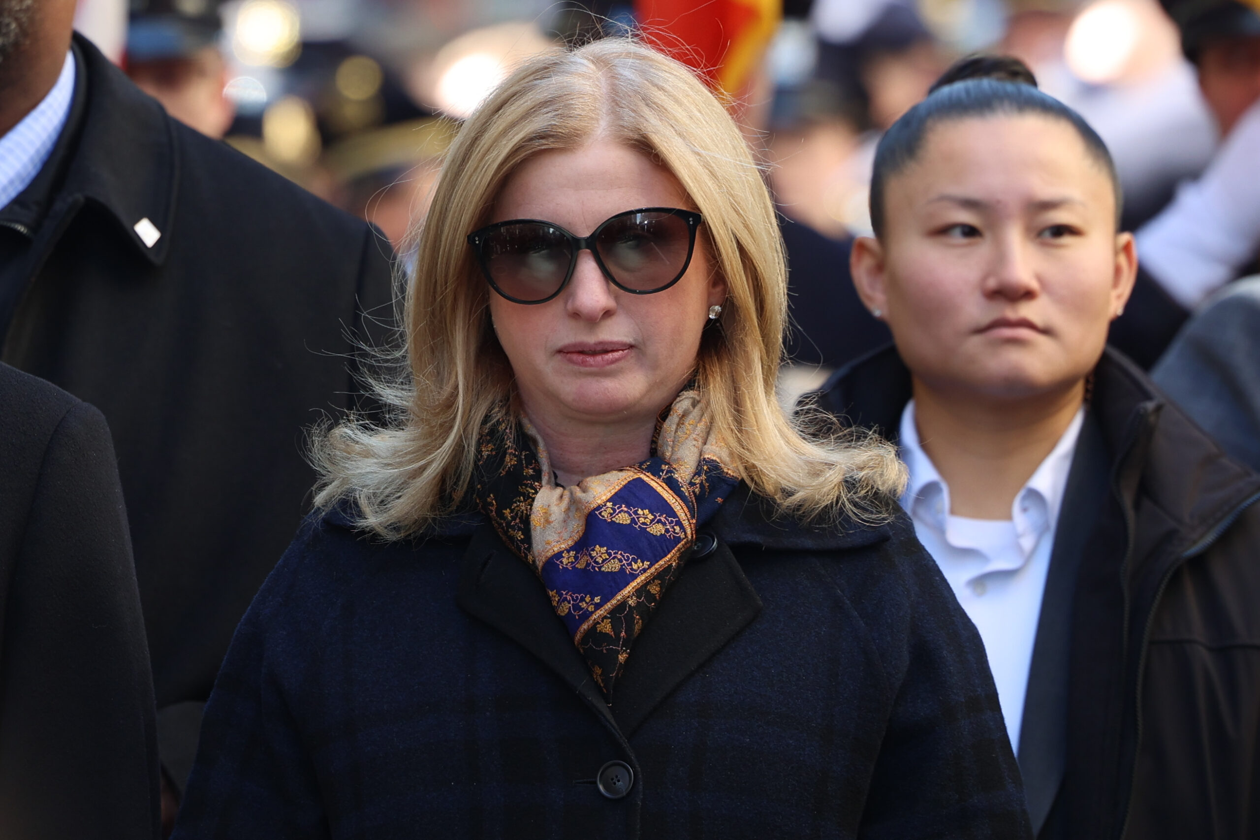 Police Commissioner Jessica Tisch sported sunglasses while marching next to the New York City mayor.