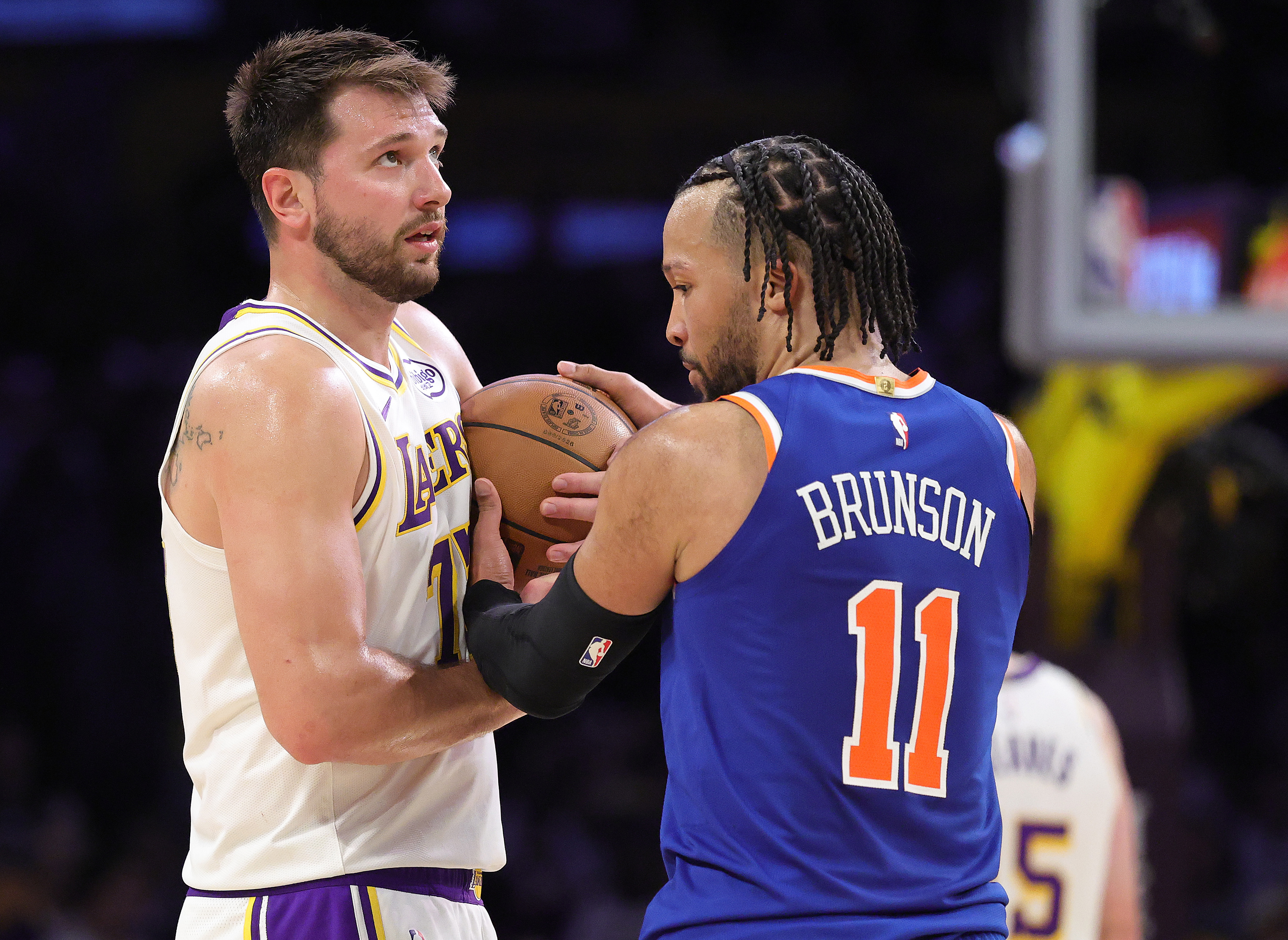 GettyLOS ANGELES, CALIFORNIA – MARCH 08: Luka Doncic #77 of the Los Angeles Lakers and Jalen Brunson #11 of the New York Knicks at Crypto.com Arena on March 08, 2026 in Los Angeles, California. (Photo by Ronald Martinez/Getty Images)