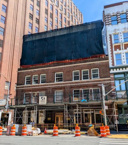 The brick building that was 80 West Broadway at Warren is nearly razed; a 13-story residential building will take its place.