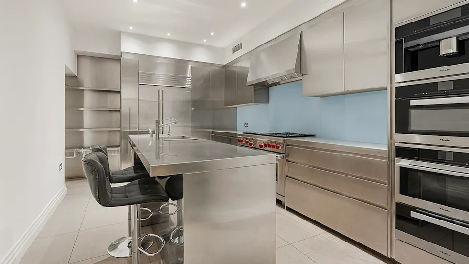 Stainless-steel appliances line the lower-level kitchen.