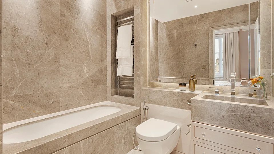 Inside a guest en suite clad in veined stone.