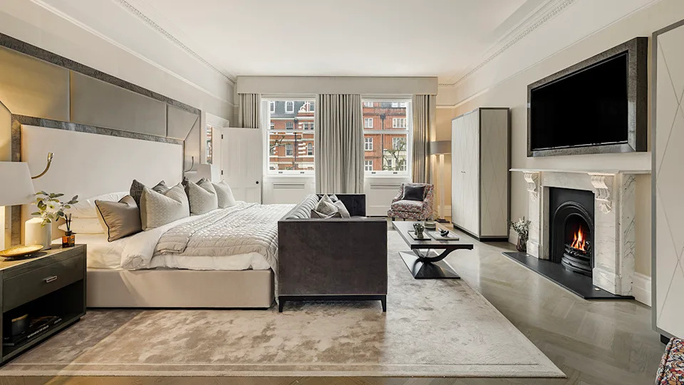 The primary bedroom has a marble-crafted fireplace.