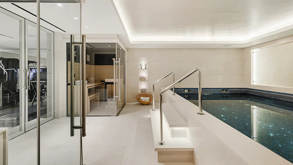 A pool room with sauna and steam rooms sits next to the gym.