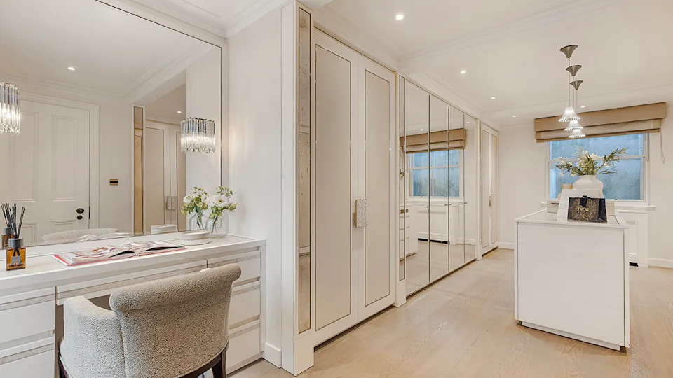A dressing room with a barrel ceiling and mirrored doors separate the primary and en suite.