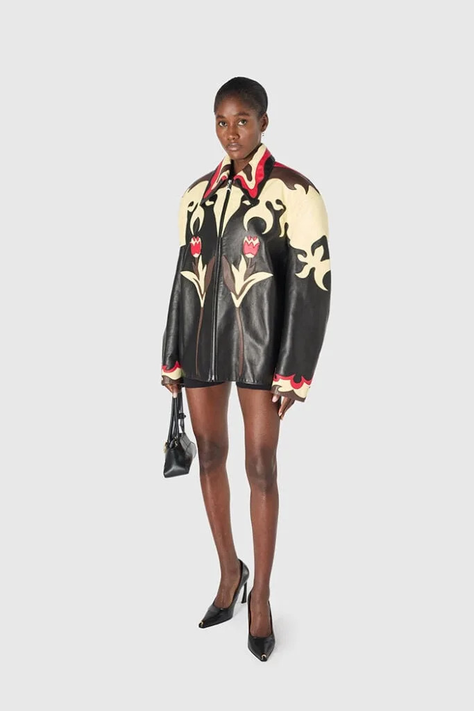 Dressed in a striking leather set by Marine Serre, featuring a structured jacket layered over a sculpted bustier mini dress, both pieces were adorned with the label’s signature crescent Moon motif, reimagined here alongside flame-like curves and floral accents in a palette of black, cream, and vivid red. The graphic finish gives the look a sharp, rebellious tone.