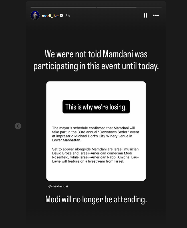 NEW YORK (VINnews) — Jewish comedian Mordechai Rosenfeld, known professionally as Modi, said Monday he will not attend an annual Passover-themed event in Lower Manhattan after learning that New York City Mayor Zohran Mamdani is scheduled to participate.