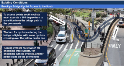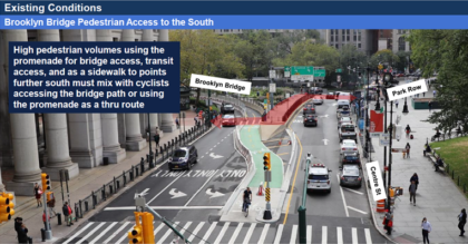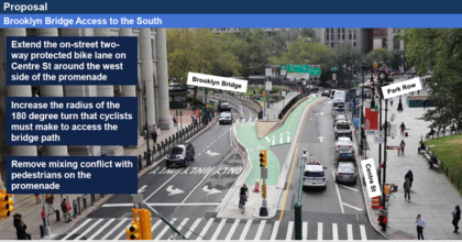 You may recall that DOT announced changes two years ago that would alleviate the chaos at the combined pedestrian crossing right next to the halal vendors on the east side of City Hall Park — from what I can tell in the renderings, this is the exact same plan. It’s a welcome change — and also a necessary one now that the bike path is busier than ever. There was a 150 percent increase in Brooklyn Bridge riders between 2020 and 2023.
