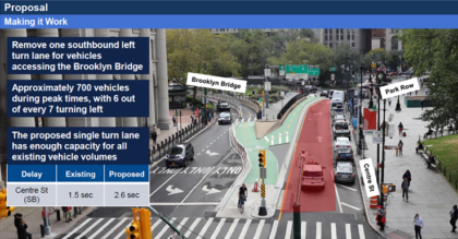 But bikers coming from City Hall Park will still have to cross Centre along with the pedestrians coming on and off the bridge promenade. What they will avoid is the crazy 180-degree turn on and off the bike path (see image below).