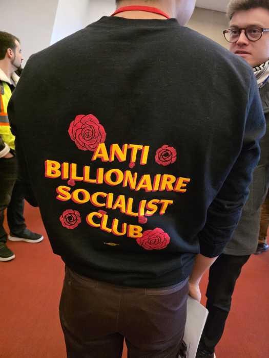 Many rally attendees wore merch showing their support for socialist and other left-leaning candidates and positions. Photo by Emily Swanson