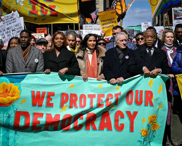 Left to right: NYC Public Advocate Jumaane Williams, NYS Attorney General Letitia James, activist Padma Lakshmi, actor Robert De Niro, and Rev. Al Sharpton joined the “No Kings” march in Manhattan.Photo by Gabriele Holtermann