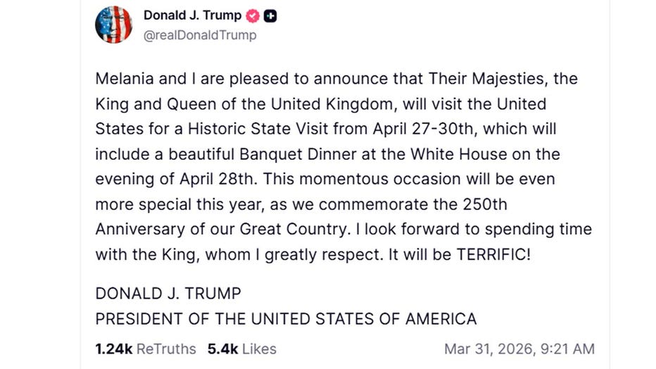 Trump confirmed the visit Tuesday in a post on Truth Social, saying he and first lady Melania Trump look forward to welcoming the royal couple for a “Historic State Visit from April 27-30th, which will include a beautiful Banquet Dinner at the White House on the evening of April 28th.”