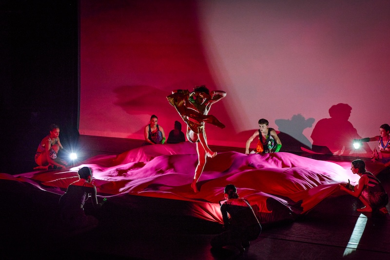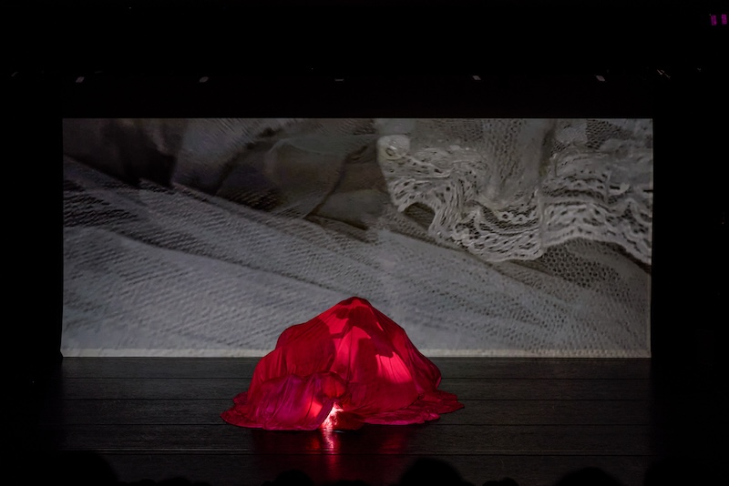 While the dancers’ movement is generous and limber, the continuously moving fabric and camerawork can at times distract from the movements of the dancers themselves. Orlin’s focus appears to be on building the surrounding world of “and when we change the landscape…” rather than constructing or sequencing choreographic movement together as a linear narrative. In a final sequence, the dancers flip the camera onto us in the audience, now watching our own faces and reactions to their work as they skim past the front row toward the theater’s exit, gently blowing kisses goodbye. Aspects of this work left me uncertain in terms of its storyline and symbolism, though Orlin’s bold use of props and media keep the structure of the work engaging and unpredictable.