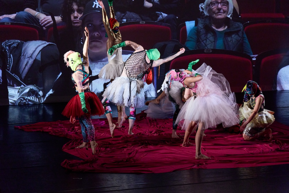 In addition to the livestream, Orlin adorns the stage with an array of textiles, tutus, masks, and fabrics, including a stuffed gold bodysuit that unexpectedly drops from the ceiling. In a grotesque ritual, the dancers begin gutting the golden “body,” eventually pulling out a lengthy, dark reddish fabric from its seams.
