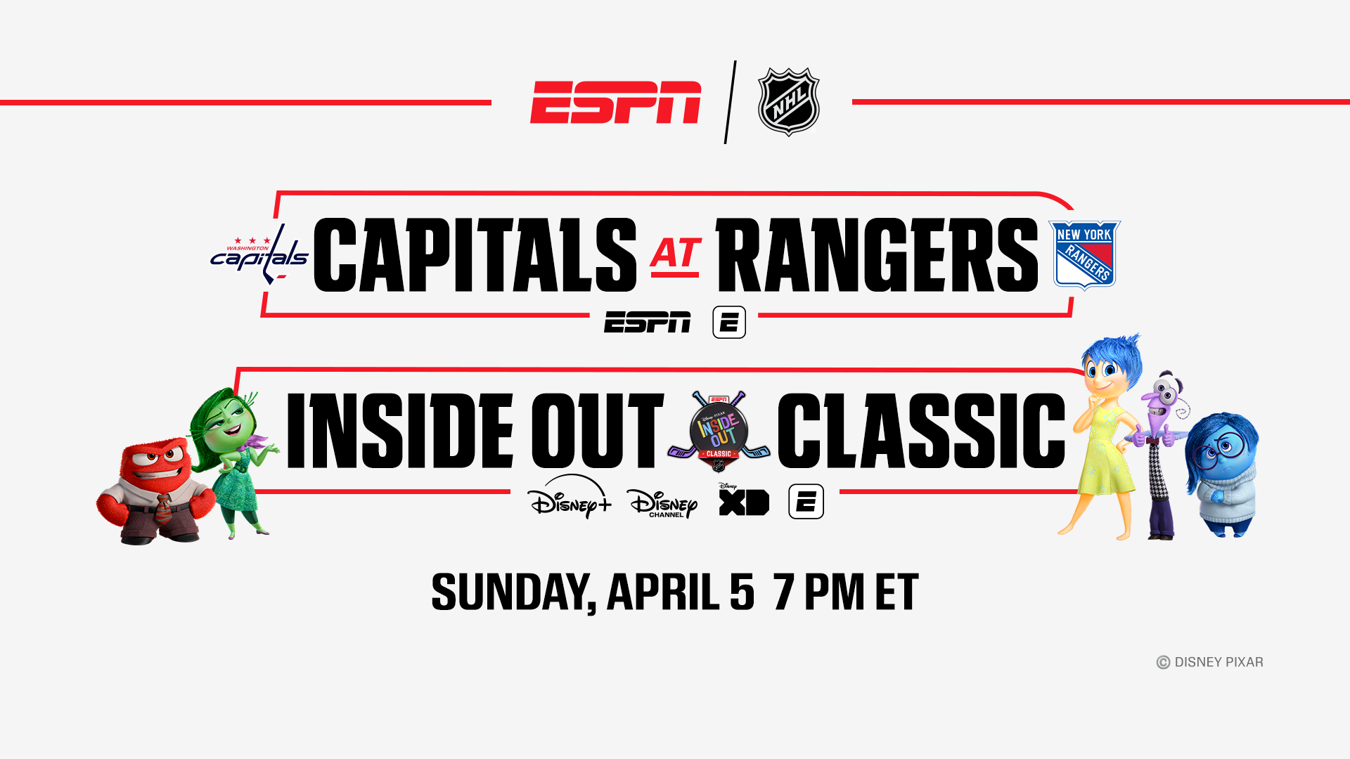 ESPN+, Disney+, Disney Channel, and Disney XD to present real-time Inside Out Classic animated presentation of Washington Capitals vs. New York Rangers on Sunday at 7 p.m. ET; Inside Out Classic complements traditional NHL telecast on ESPN