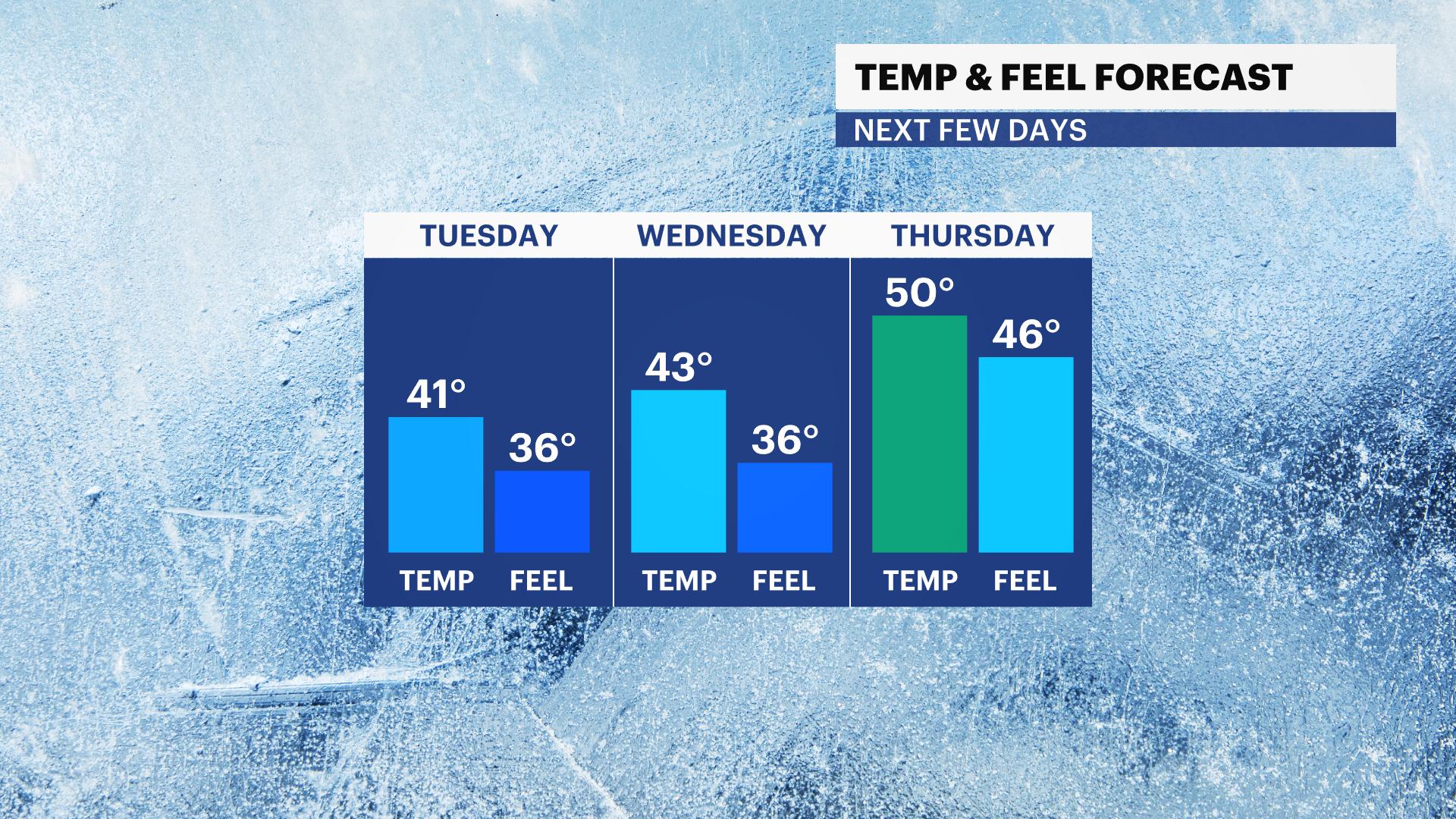 It’s another chilly start to the day with wake-up temperatures in the mid-40s. Today will be similar to this weekend with highs in the mid- to upper- 50s. Tonight will be the coldest night so far this season with lows near 43 degrees. It stays dry through Tuesday evening with increasing clouds and temperatures in the upper-50s.