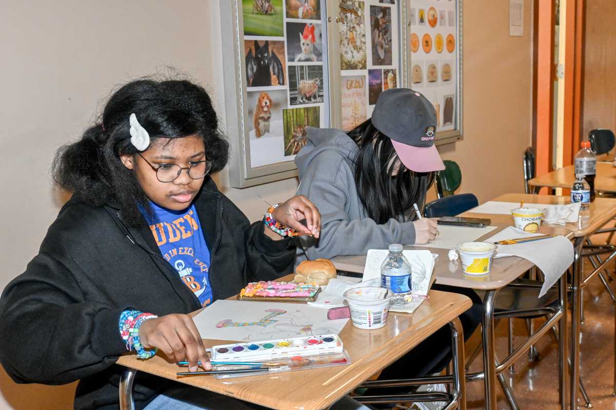 Students sat at desks during the celebration and created art pieces in real time.Photo by Alice Moreno