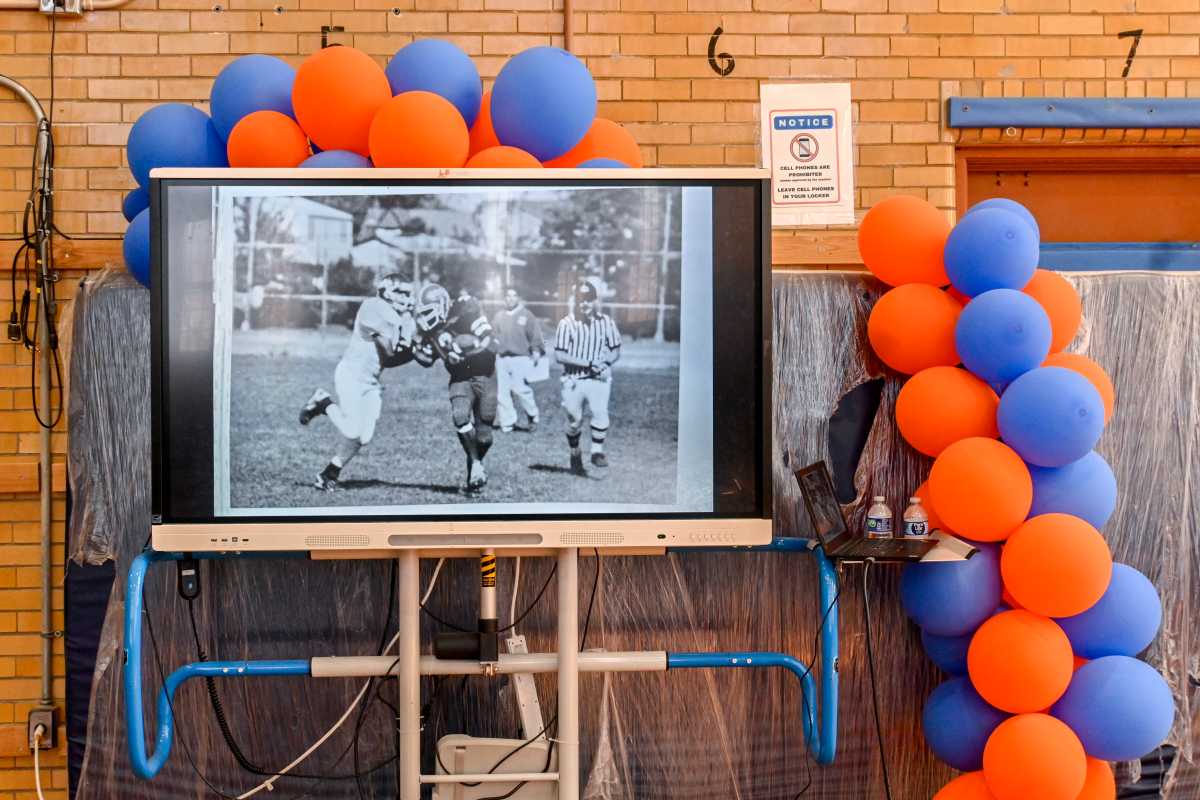 Sports teams from former class years lit up a screen in the school’s gym, letting attendees reminisce about their past wins.Photo by Alice Moreno