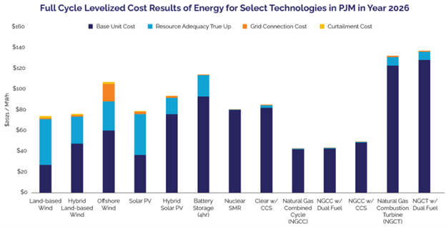 Other research examining electricity markets reaches similar conclusions. When the full cost of connecting resources to the grid and maintaining resource adequacy is included, natural gas generation consistently outperforms many other technologies on cost.