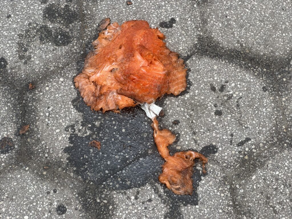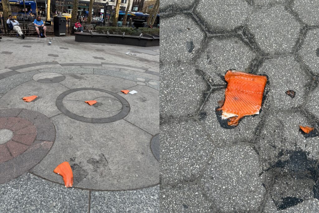 Five salmon filets were found strewn on the ground in Verdi Square next to the West 72nd Street 1, 2, and 3 train station.