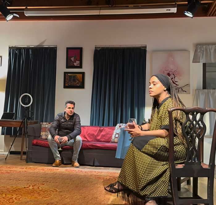 Diego (Jonathan Hare) and Petra (Sandie Luna) cut the final strands of their relationship in the third and final scene of “Petra.” Photo courtesy iD Studio Theater