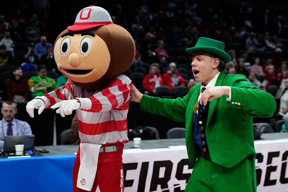 Ohio State mascot Brutus Buckeye and the Notre Dame Fighting Irish leprechaun mascot cheer prior to the NCAA women’s basketball tournament second round game at the Jerome Schottenstein Center in Columbus on March 23, 2026.
