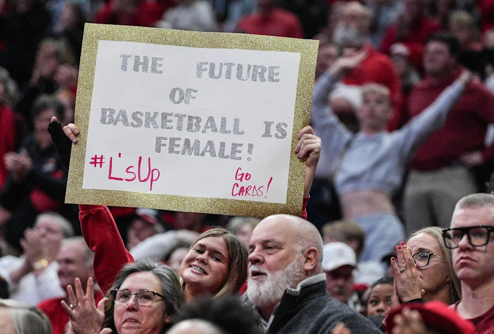 A Louisville fan held a sign in the final seconds as the Cards defeated Alabama 69-68 to move on to the Sweet 16 during the 2026 NCAA Women’s March Madness Second Round basketball at the KFC Yum Center In Louisville, Ky. March 23, 2026.