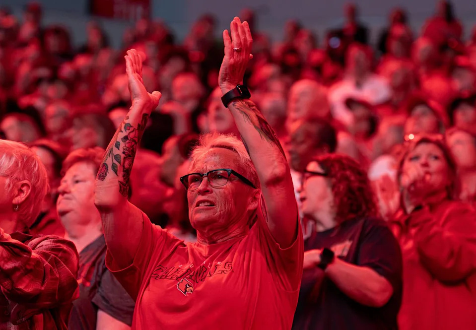 Louisville fans cheer during a first-round game between the Louisville Cardinals and Vermont Catamounts in the 2026 NCAA WomenâÕs Basketball Tournament at the KFC Yum Center, March 21, 2026, in Louisville, Ky.