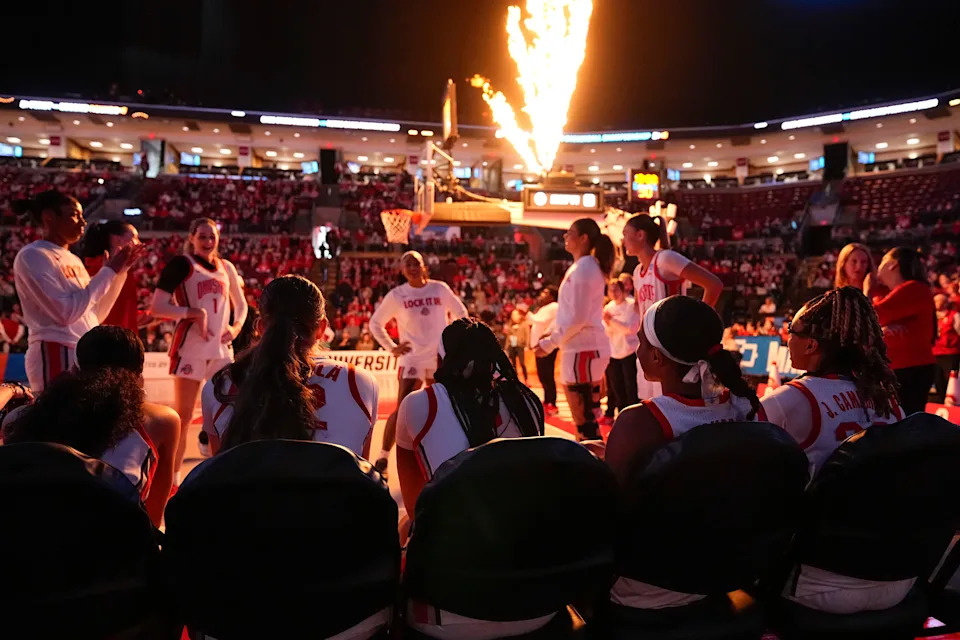 The Ohio State Buckeyes sit for the starting lineup prior to the NCAA women’s basketball tournament second round game against the Notre Dame Fighting Irish at the Jerome Schottenstein Center in Columbus on March 23, 2026.