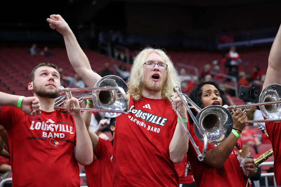A member of the Louisville Cardinals band performs during the third quarter against the Alabama Crimson Tide in the second round of the 2026 NCAA Women’s Basketball Tournament at KFC YUM! Center on March 23, 2026 in Louisville, Ky.