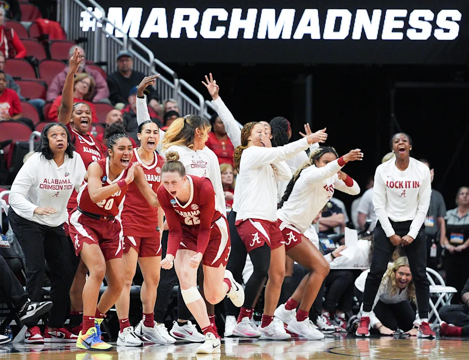 The Alabama bench celebrate after a big three-point shot by Alabama Crimson Tide guard Karly Weathers (22) in the fourth quarter against Louisville during the 2026 NCAA Women’s March Madness Second Round basketball at the KFC Yum Center In Louisville, Ky. Weathers finished with 13 points. March 23, 2026.