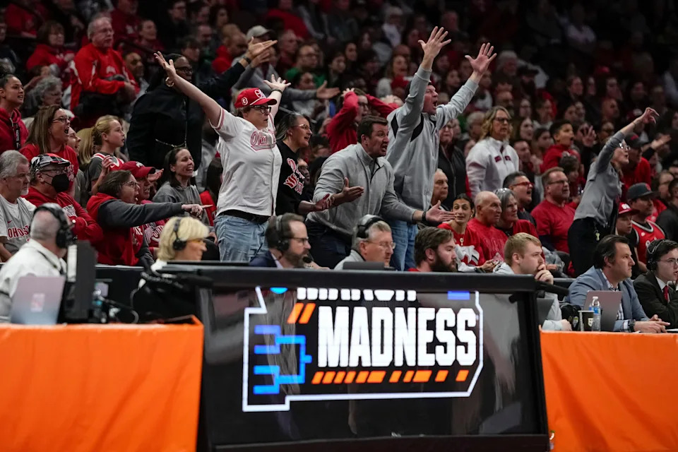 Ohio State Buckeyes fans react to a foul call during the NCAA women’s basketball tournament second round game against the Notre Dame Fighting Irish at the Jerome Schottenstein Center in Columbus on March 23, 2026.