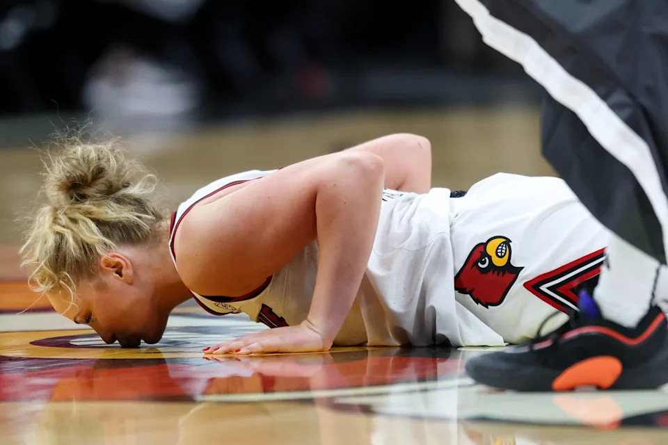 Laura Ziegler of the Louisville Cardinals kisses the court after her team’s 69-68 victory over the Alabama Crimson Tide in the second round of the 2026 NCAA Women’s Basketball Tournament at KFC YUM! Center on March 23, 2026 in Louisville, Ky.