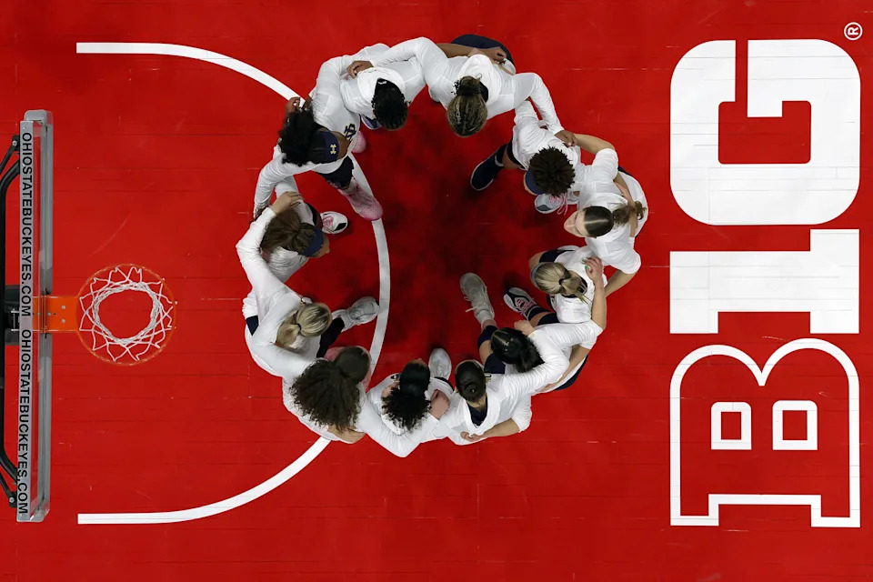 The Notre Dame Fighting Irish huddle up prior to the start of the NCAA Women’s Basketball Tournament Second Round game against the Ohio State Buckeyes at Jerome Schottenstein Center on March 23, 2026 in Columbus, Ohio. Notre Dame defeated Ohio Sate 83-73.