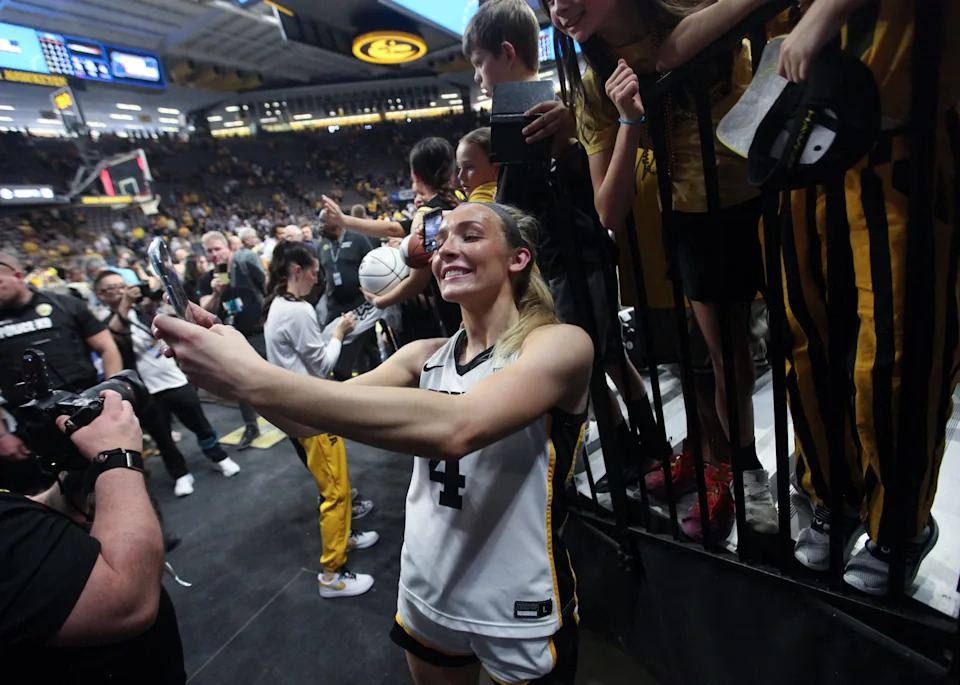Guard Kylie Feuerbach #4 of the Iowa Hawkeyes interacts with fans after a match-up against the FDU Knights on March 21, 2026 at Carver-Hawkeye Arena during the first round of the NCAA Women’s Basketball Tournament in Iowa City, Iowa.