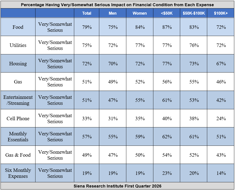 Of the monthly living expenses that New Yorkers face, a majority of New Yorkers (57%) say that food, housing, and utility costs are having a very or somewhat serious impact on their financial condition. Compared to the previous quarter, the impact of housing costs for New Yorkers remain unchanged at 72 percent very or somewhat serious, the impact of utilities is up five percentage points at 75 percent, and the impact of food costs rose from 78 percent to 79 percent. Fifty-one percent say streaming and entertainment services are a serious financial strain (up from 49% last quarter). Fifty-one percent of all New Yorkers say that current gasoline prices are having a very serious or somewhat serious impact on their financial condition, an increase of five percentage points from last quarter. The seriousness of cell phone costs declined to 33 percent (down from 36%). Nineteen percent of residents (up from 18% last quarter) report that all six key monthly expenses—food, gas, housing, utilities, entertainment, and cell phones—are weighing heavily on their finances.