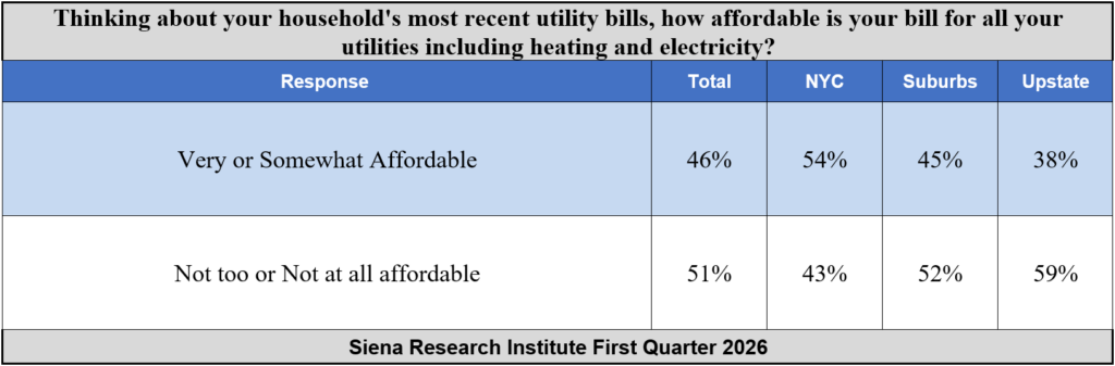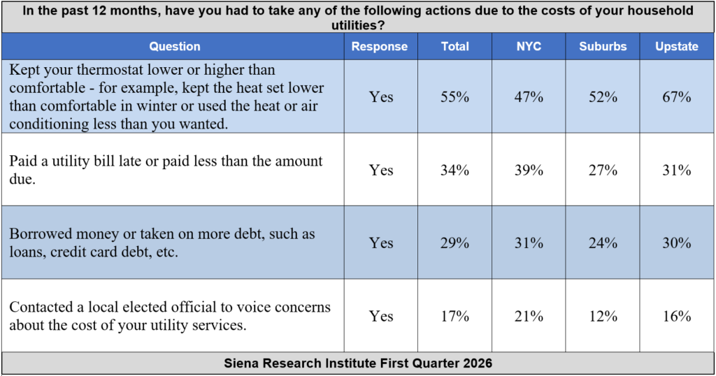“Three-quarters of New Yorkers say that their utility bills are having a serious impact on their financial condition and 51 percent say their utility bills are unaffordable. However, the pain is not shared equally across New York. Fifty-nine percent of upstate New York residents say that their utilities are unaffordable while 54 percent of New York City residents say that their utilities are affordable”, Brodbeck said. “In response to these financial pressures, many NY’ers are adjusting their thermostats, and a third of utility paying residents are paying bills late, 3 in 10 are taking on more debt, and nearly 1 in 5 have contacted their elected officials.”