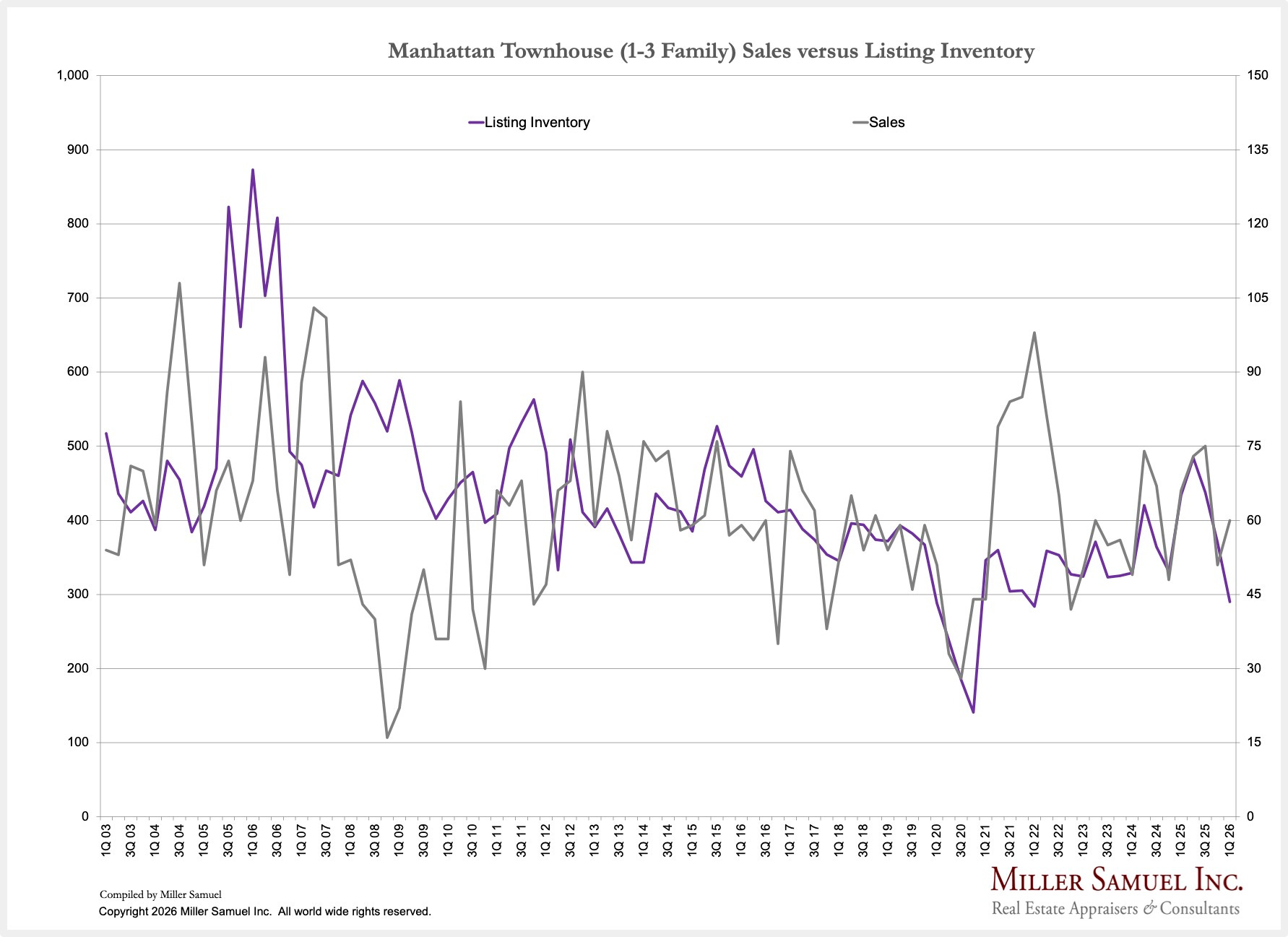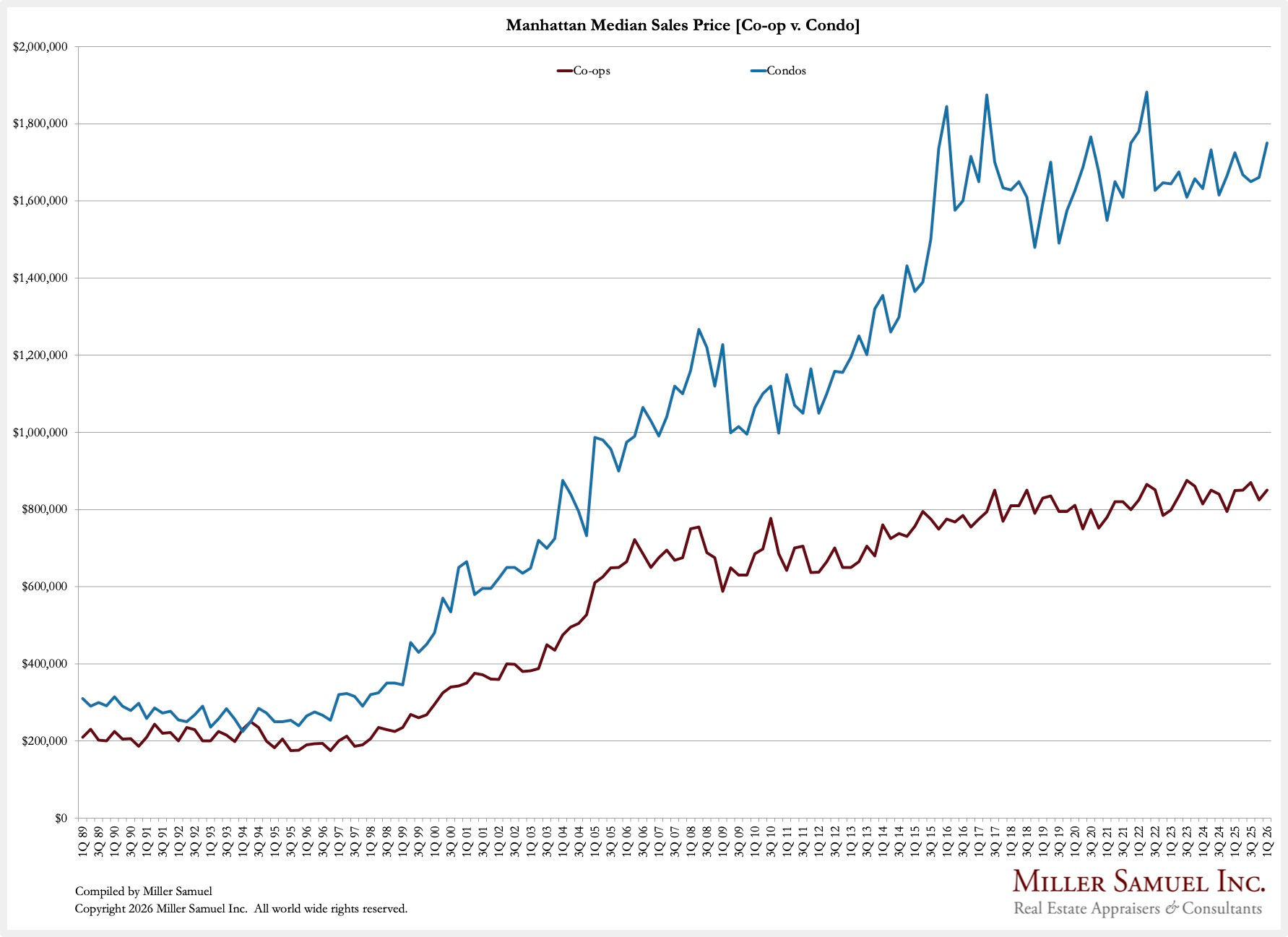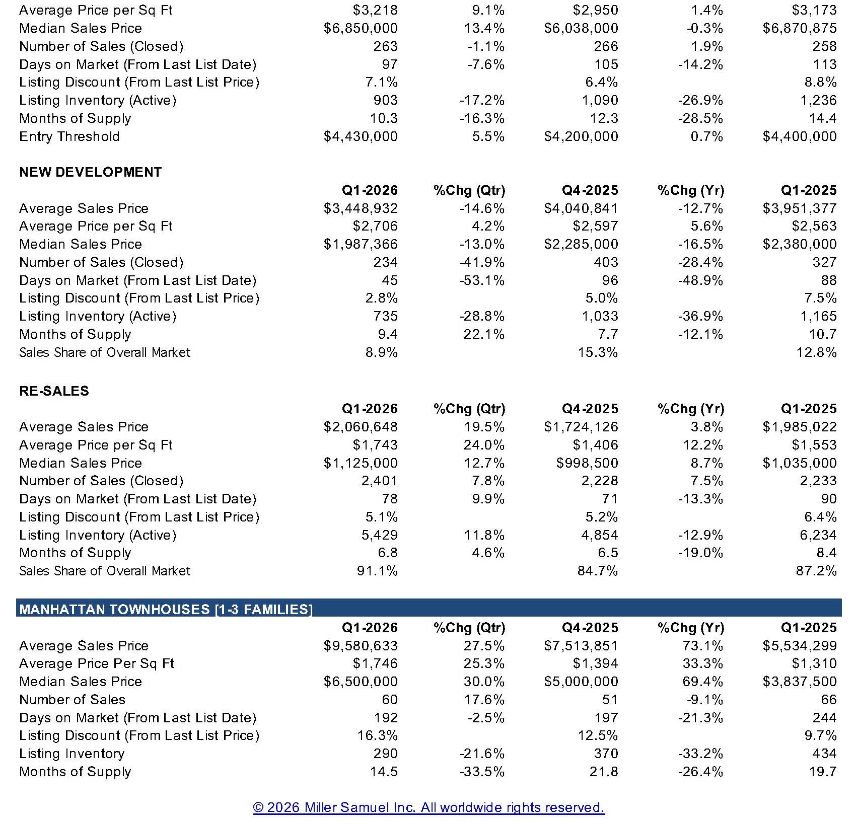 April 1, 2026: After 32 years of Manhattan housing market coverage, I have struck out with my own report effort and plan to continue the series, with quarterly releases. Initially, the report write-ups with charts will appear at HousingNotes.com. I plan to keep the co-op and condo analysis methodologies consistent, but I am adding the Manhattan townhouse market (1-3 families) as a new, separate addition to this quarterly effort.
