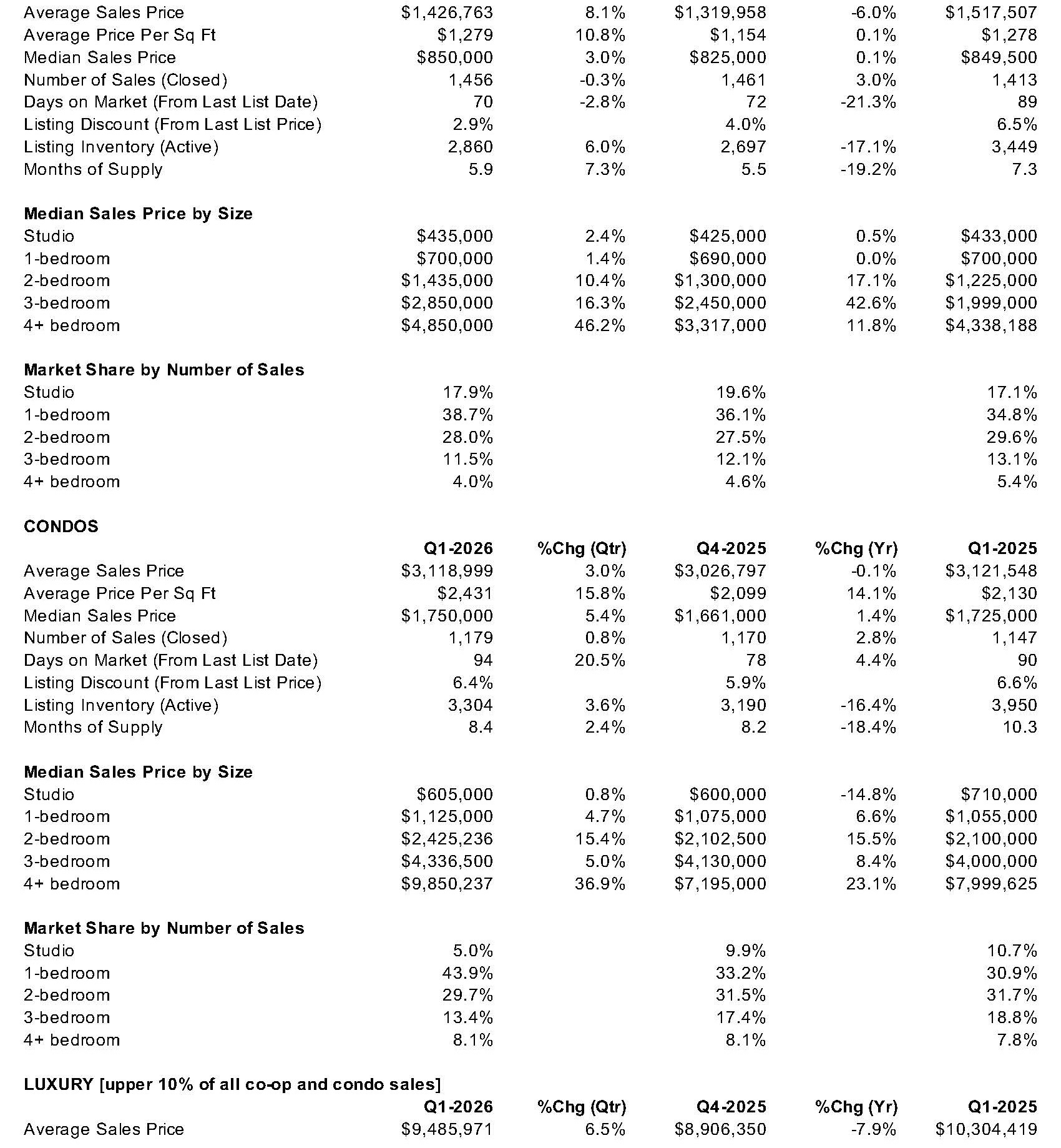 The average co-op/condo sale is skewing smaller and less new-development heavy: the average price slipped 2.3% even as the median hit the second-highest on record, because average size fell and new development’s share (8.9%) sat well below its 10-year first-quarter norm (11.7%).