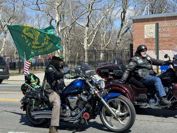 Motorcyclists roar down Gerritsen Avenue as part of the 16th annual Gerritsen Beach St. Patrick’s Day Parade.Photo by Meaghan McGoldrick O’Neil