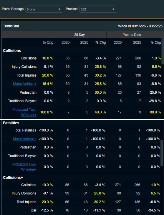 The latest available traffic accident statistics for the 52nd Precinct, which covers Bedford Park, Fordham, Kingsbridge, Norwood, Bronx Park, and University Heights are attached.
